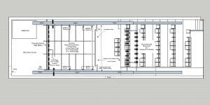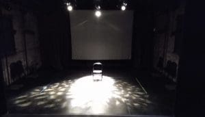 The sound system is an analog sound board with five speakers. One speaker is over house, and four are on stage (DSL, DSR, USL, USR). We have a Shure body-mic system with eight body-mics using Countrymen style mic elements, though we don’t tend to use body-mics with our indoor stage.