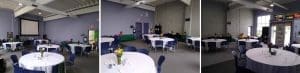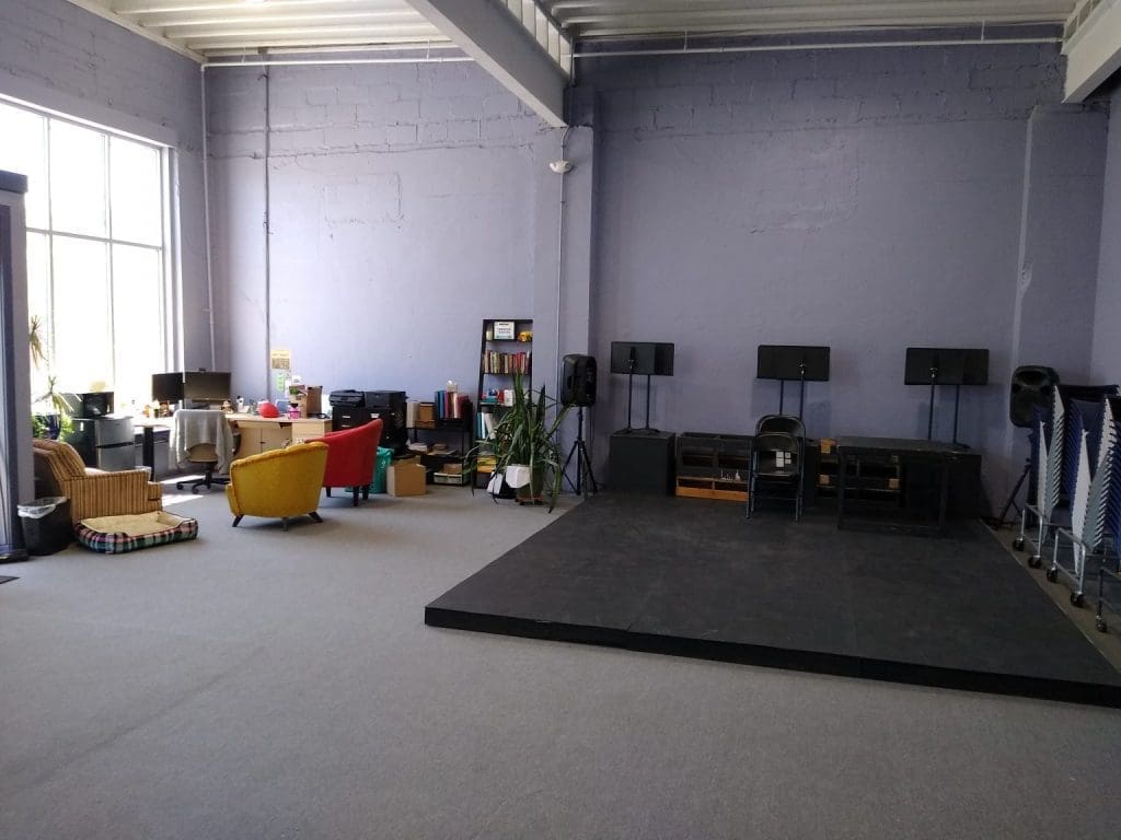 The Basile Collaboration Center Stage is a thrust stage with seating on two sides. The BCC stage does not have a fly space (no curtains flying in or out) and seats up to fifty audience members with full wheelchair access. The seating is movable and can be rearranged for different events. This space is ideal for smaller productions, works shops, staged readings, small bands, rehearsals and small corporate and community events.